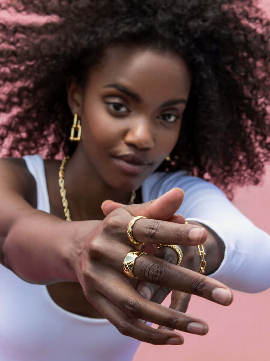 Our crisscross detailed Nneoma ring effortlessly combines simplicity with intricate design. This ring features a vintage-inspired quilted matelassé design. Its wide band offers both comfort and a striking look, making it the perfect accessory for adding a touch of sophistication to any outfit. Ideal for those who love distinctive, fashion-forward pieces, this ring can be worn alone as a standout item or layered with other rings for a more eclectic style. Available in two thicknesses, it caters to your style preferences and ensures versatility in your jewelry collection.